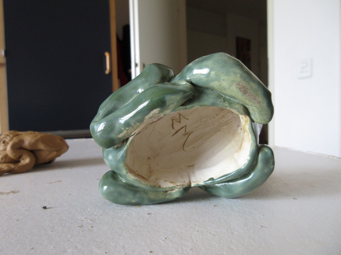 Het is de bedoeling om een behoorlijk aantal kikkers te gaan maken met verschillende kleuren klei om mee te experimenteren qua kleur en dit zijn prima karweitjes in een verloren uurtje. Al ze klaar zijn en goed gedroogd bewerk ik sommigen met kleurpigmenten en anderen met glazuur maar daar ga ik nog even over nadenken. Nu zorg ik eerst dat ik er een behoorlijk aantal heb waar ik mee kan experimenteren.