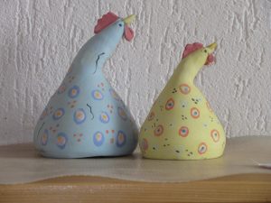 De kippen die ik eerder maakte werden in een verschillende mallen qua groottes gemaakt. De kippen die ik nu heb gemaakt zijn gedraaid wat een heel andere werkmethode en aanblik is.