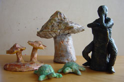 je over de uitstekende delen zodat er een lichte goudglans ontstaat. Klik op de verschillende afbeeldingen van de foto om de grote foto's te bekijken. Nog een manier om een bronskleur te krijgen. Beschilder de ondergrond met goudverf of gebruik een spuitbus. Verf het daarna nog een keer met groene verf en veeg dat er weer zoveel mogelijk af. Daarna beschilderen met witte verf die je er voor het grootste gedeelte ook weer afveegt. Zint het effect je niet dan kan je alles over schilderen. Een totaal andere manier is het werkstuk schilderen met zwarte verf en als tweede laag beige verf, die er weer min of meer wordt afgeveegd. En als laatste kan je een werkstuk insmeren met was of schoensmeer om het daarna uit te poetsen. Een leuke maar dure manier is het werkstuk van klei in brons te laten gieten, het resultaat is vaak verbluffend. Er zijn natuurlijk nog veel meer manieren om klei te behandelen maar daar heb ik geen ervaring mee. Wil je iets weten over het maken van beelden in hout, klik dan op de volgende link Teleac cursus
