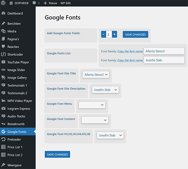 We gebruiken het font Allerta Stencil voor de Site Titel en Josefin Slab voor de Site beschrijving en de formats H1 t/m H6.