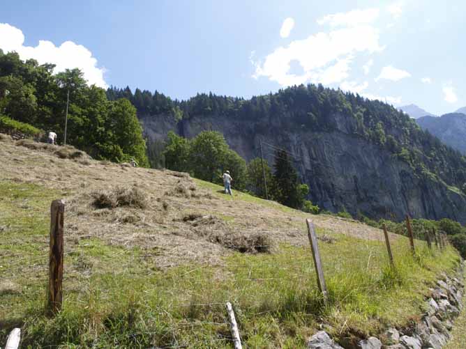 | We zitten een tijdje op een bankje te genieten van het uitzicht. Wat later lopen we naar beneden de plaats in en drinken een kop koffie. Na de koffie lopen we aan de andere kant van het dorp naar beneden, we volgen nu een ander kerkpad dat eerst richting Zweilütschinen loopt en dan terug buigt richting Lauterbrunnen, een fantastisch mooi pad waar veel valt te zien. De boeren zijn op het land bezig het hooi binnen te halen en alles gebeurt nog met de hand. Het is hard werken omdat ze tegen de helling aan moeten werken. | |||||||||||