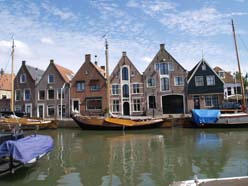 | We vertrekken vroeg naar Edam zodat we op tijd kunnen gaan wandelen. We parkeren de auto in de buurt van het busstation en lopen nog een stuk door Edam voordat we de dijk opgaan. We kunnen Volendam op afstand zien liggen. Na een aantal kilometers komen we aan de rand van Volendam en lopen verder over de dijk het dorp in. Het is nog rustig, de winkels gaan net open.We kopen een kaartje voor de veerboot en varen met de boot naar Marken. (Rondje Marken) |